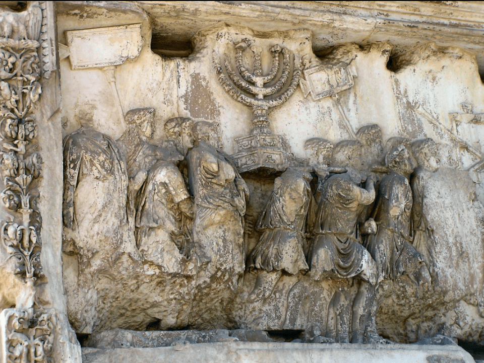 Het is ter ere van de beëindiging van de Joodse opstand in de eerste eeuw en de verwoesting van Jeruzalem en de tempel van Salomo. Hier zie je een fragment daarvan, het wegdragen van de tempelschatten, waaronder de menora.